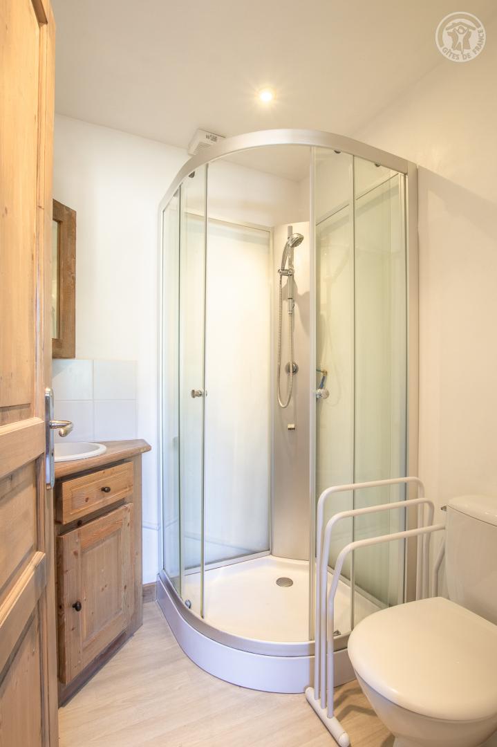Chalet individuel sur 3 niveaux avec stationnement privatif extérieur et terrasse en bois de 150 m2. Au rez-de-chaussée : entrée, salon avec coin TV (Canal Sat), bar et cheminée, cuisine professionnelle, salle à manger, buanderie, 3 chambres avec salle d'eau (douche + wc) privative (1 lit 2 pers en 180x190 cm / 1 lit 1 pers en 90x190 cm / 1 lit 1 pers en 90x190 cm ) et 1 chambre PMR avec salle d'eau privative (1 lit 1 pers en 90x190 cm). Salle d'eau (douche + wc). Au 1er étage : 2 chambres avec salles de bain (baignoire + wc) privatives (1 lit 2 pers en 160x200 cm/1 lit 2 personnes en 160x200 cm), une suite avec baignoire + salle d'eau privative (douche + wc) comprenant espace salon et coin bureau (1 lit 2 pers en 180x200 cm), 1 salle d'eau (douche). Au 2ème étage : 2 chambres avec wc privatifs (1 lit 2 pers en 140x190 cm/1 lit 2 pers en 140x190 cm). Cave à vin, mazot, terrain naturel extérieur. Terrain de pétanque. Garage pour vélos et skis.