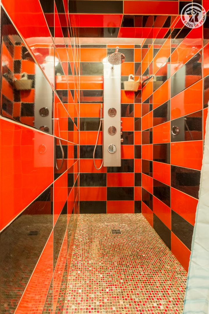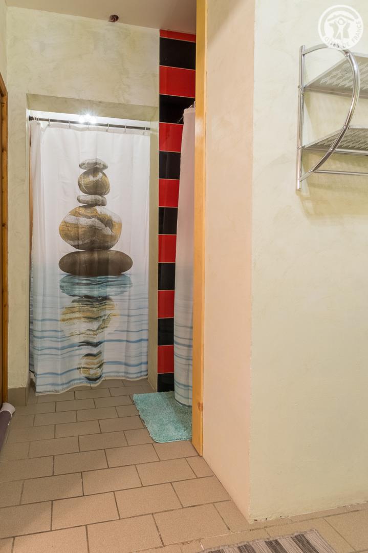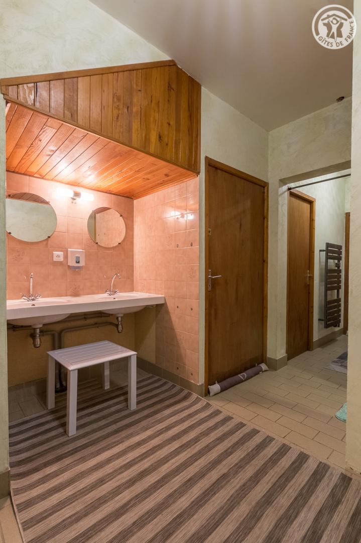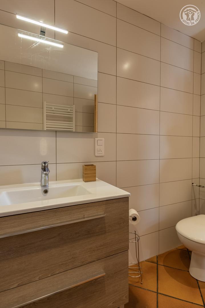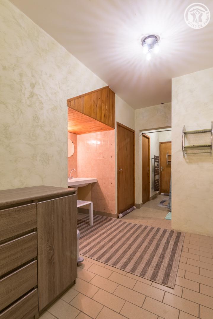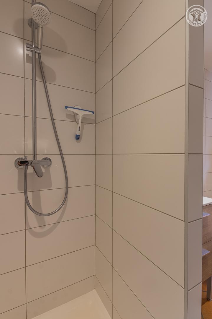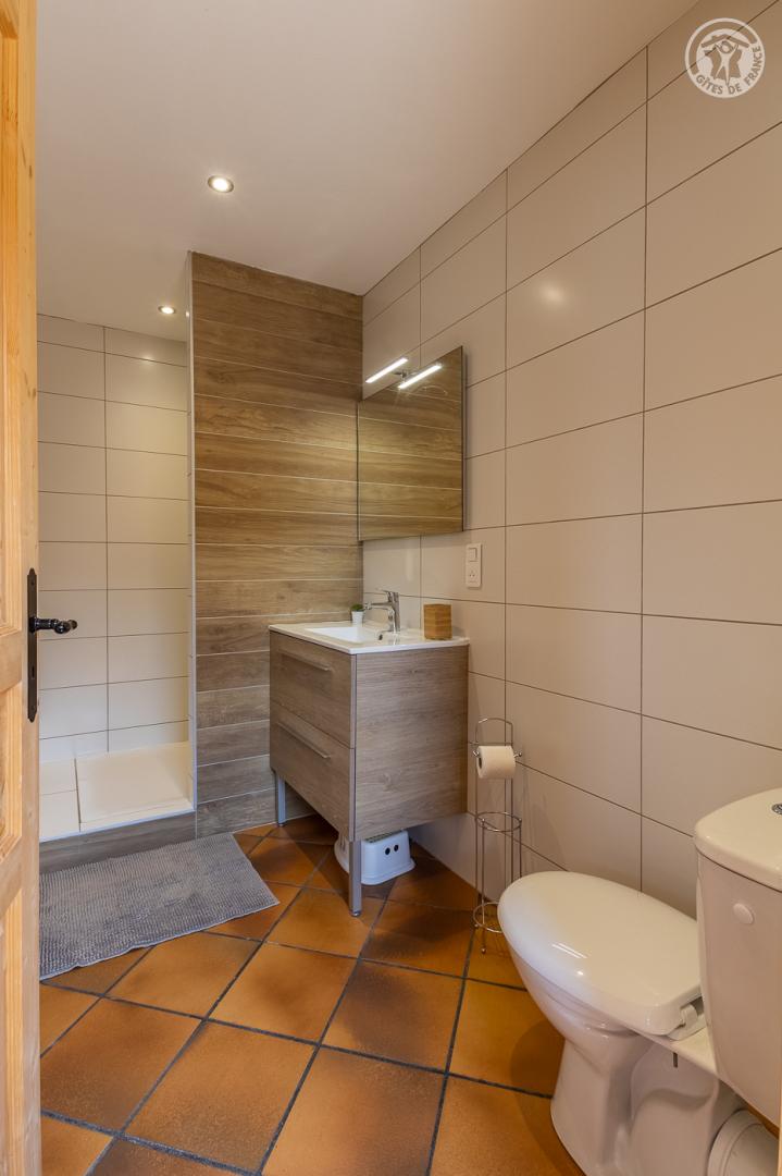 Gîte dans une maison comportant un autre gîte et une habitation. Sur 2 niveaux. Au rez-de-chaussée (entrée par un sas commun). Parking 2 places. Séjour-cuisine-salon. lecteur CD Bluetooth MP3, 3 chambres (1 lit 2 personnes 160x200 cm et 2 lits 1 personne superposés / 2 lits 1 personne en 90x190 cm et 2 lits 1 personne superposés / 1 lit 2 personnes 140 x 190 cm), une salle d'eau (douche avec WC). Au sous-sol : vaste salle de bain ouverte à laquelle on accède par l'escalier (pas de porte) avec WC séparé, douche fermée par un rideau et espace bain (baignoire) fermé par un rideau, buanderie séparée (lave-linge). Terrasse de 60 m2.