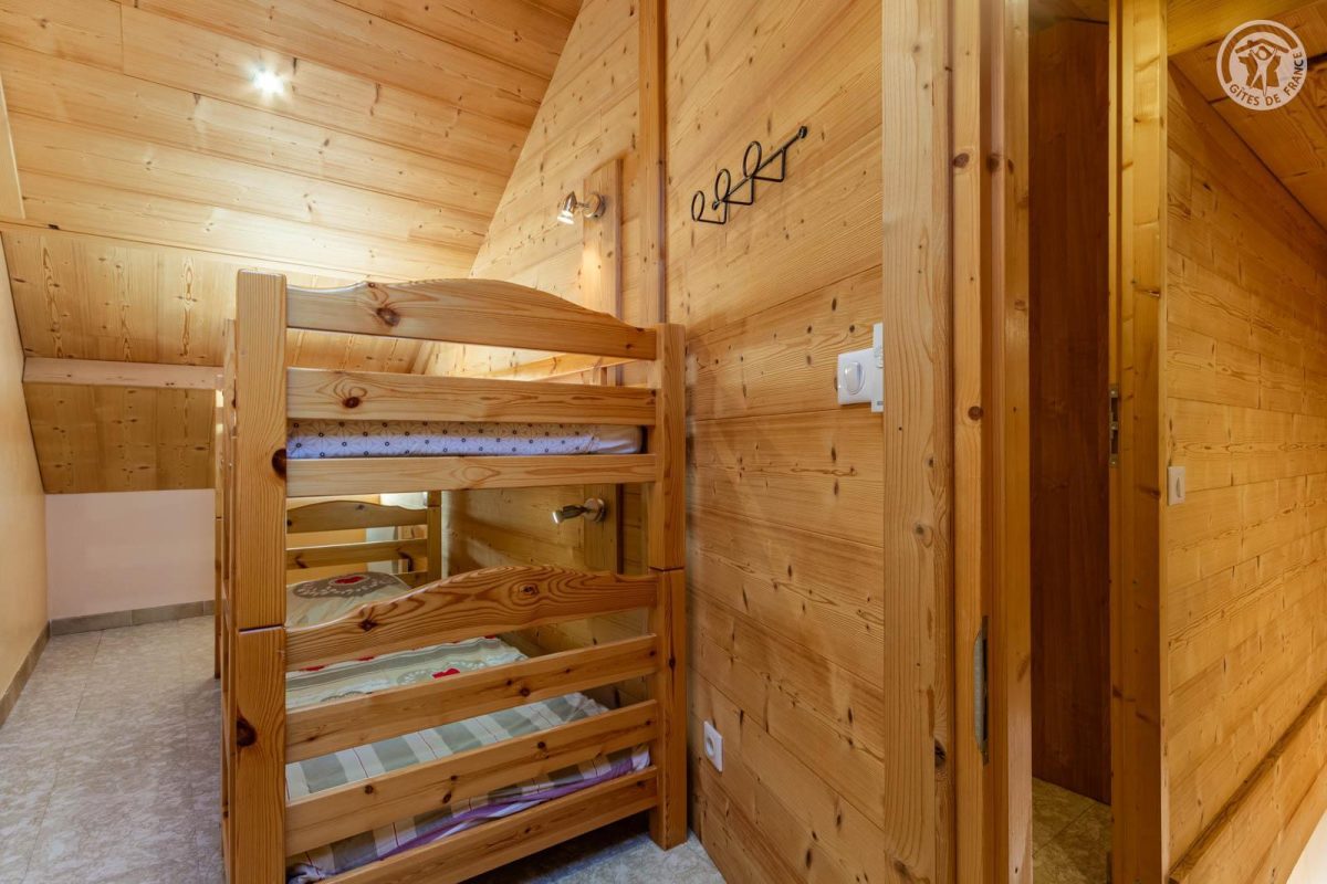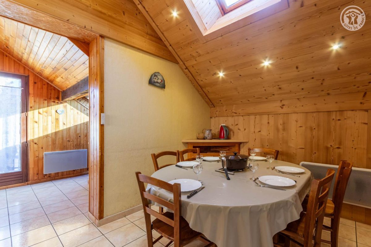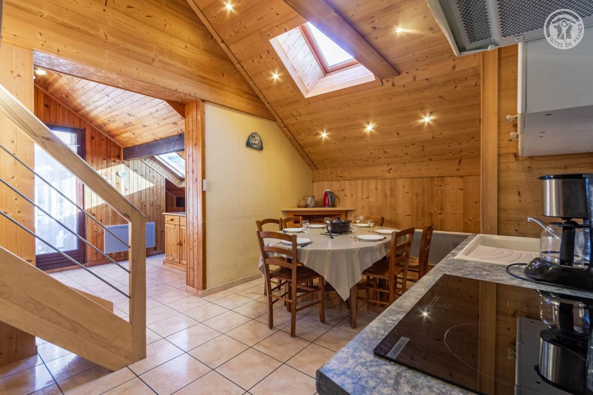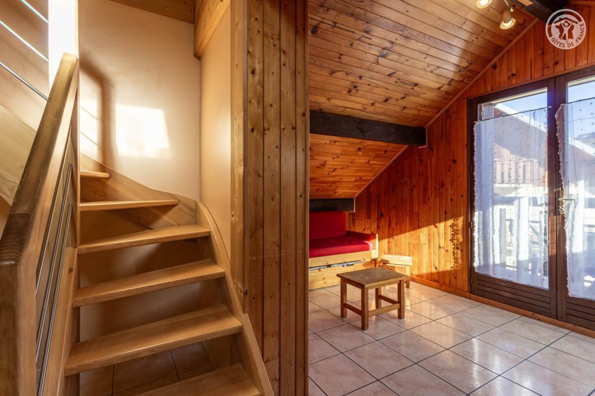 4 gîtes et un magasin de sports dans le même batiment. 2ème étage : séjour-cuisine coin salon (2 lits 1 personne gigognes 90 x 90 cm), 1 chambre (1 lit 2 personnes 140 x 190 cm), 1 chambre en sous-pente (2 lits 1 personne superposés 90 x 190 cm), salle d'eau (douche), WC séparé. Balcon. Lave-linge et sèche-linge dans buanderie commune à 200m (accès payant : 1 jeton gratuit ; au-delà, jetons payants). Terrain commun à 200m avec barbecue et espace repas extérieur. Surface totale au sol : 45m² parties mansardées comprises. Belle maison de pays au pied des pistes au coeur de la station village. Bon confort. Agréable et chaleureux. Balcon orienté sud. Belle vue dégagée sur le village et le massif. Terrain commun à 200m (balançoire, trampoline). Commerces, services et loisirs sur place.