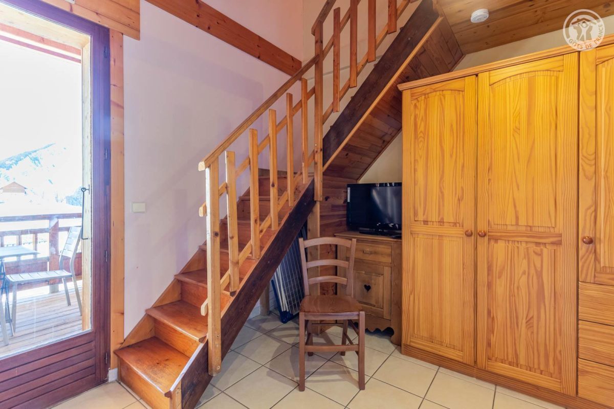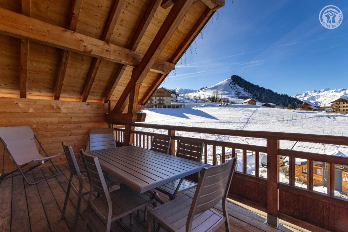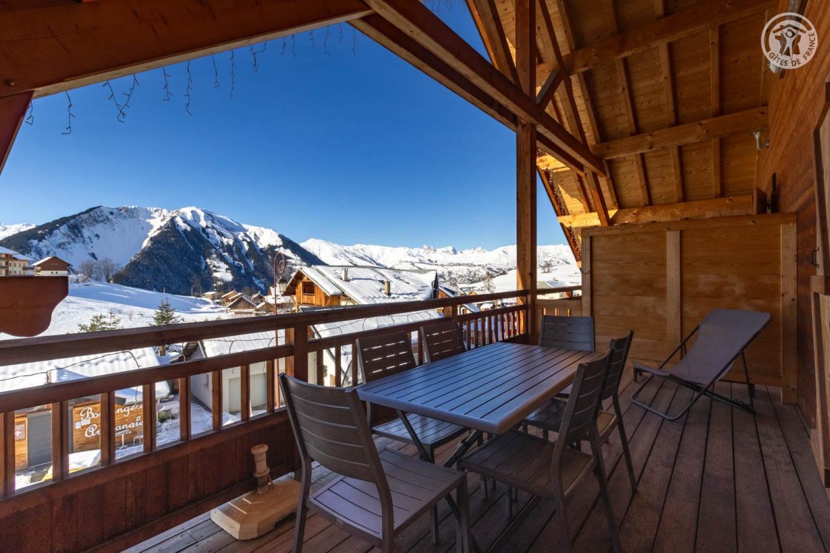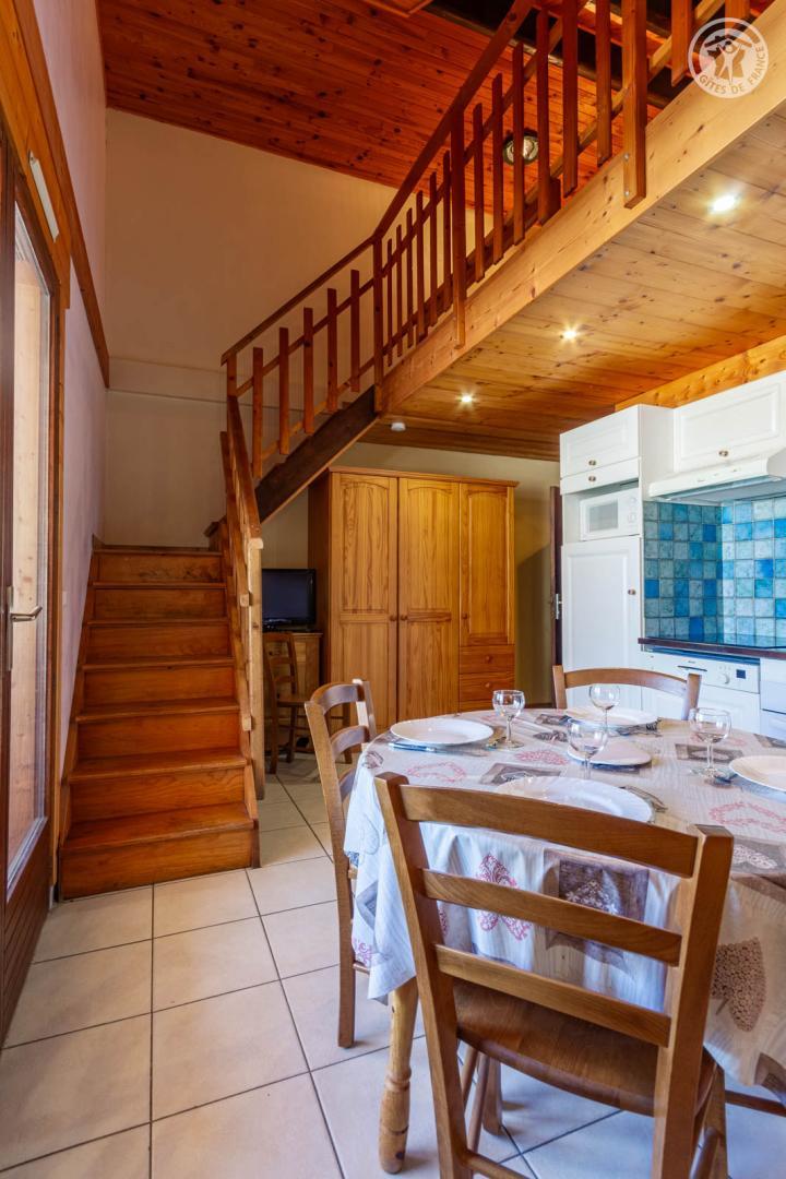 4 gîtes et un magasin de sports dans le même bâtiment. 2ème étage : séjour-cuisine coin salon (2 lits 1 personne gigognes 90 x 190 cm), 1 mezzanine en sous-pente (1 lit 2 personnes 140 x 190 cm), salle d'eau (douche), WC séparé. Balcon-terrasse abritée. Lave-linge et sèche-linge dans buanderie commune à 200m (accès payant : 1 jeton gratuit ; au-delà, jetons payants). Terrain commun à 200 m avec barbecue et espace repas extérieur. Surface totale au sol : 28 m² parties mansardées comprises. Belle maison de pays au pied des pistes au coeur de la station village. Bon confort. Agréable et chaleureux. Large balcon-terrasse exposé et abrité. Superbe vue panoramique sur le massif. Terrain commun à 200m (balançoire, trampoline). Commerces, services et loisirs sur place.