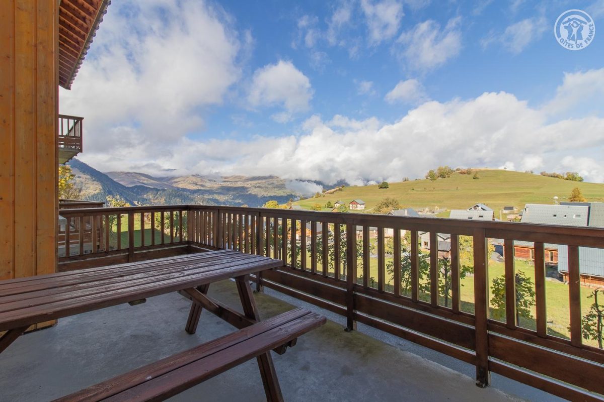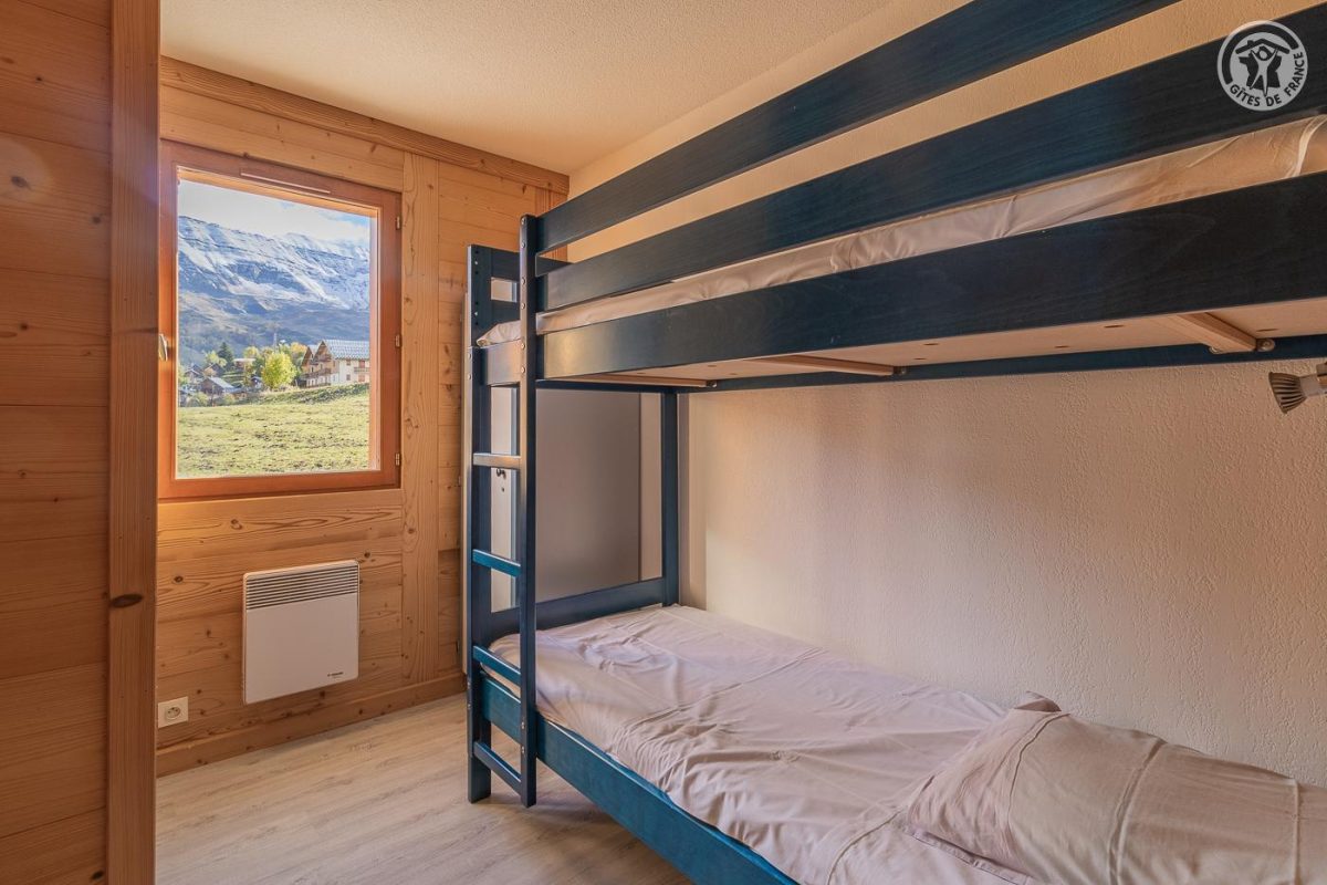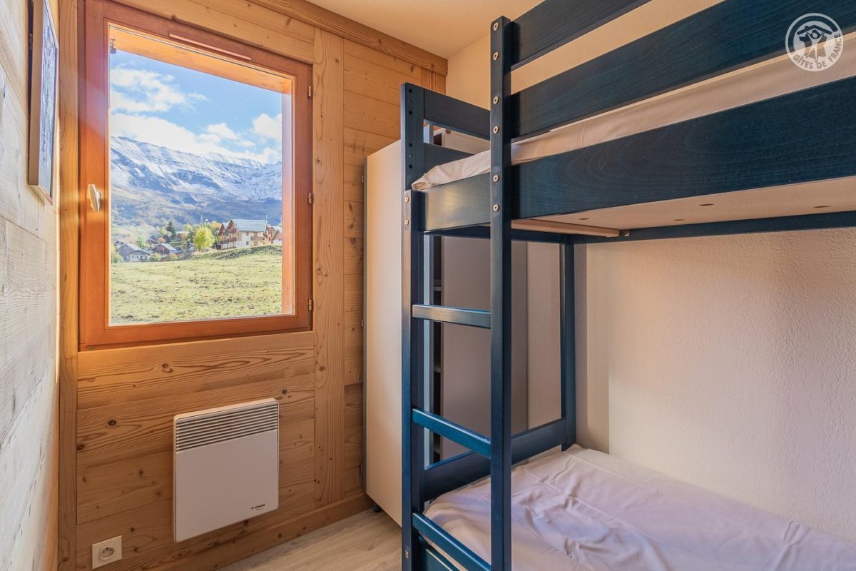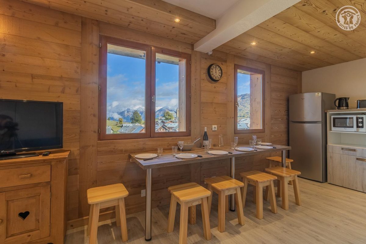 Appartement dans une résidence comprenant 13 logements : Au rez-de-chaussée : cuisine, séjour, salon avec un canapé convertible 2 personnes. Une chambre double (2 lits 1 personne). Une chambre double (2 lits superposés 1 personne). Salle de bain (douche). WC séparé. Balcon terrasse avec un coin repas extérieur. Terrain commun et espace bien-être partagé (spa et sauna) : voir les modalités avec le propriétaire. Buanderie commune (lave-linge et sèche-linge : accès payant avec 1 jeton gratuit ; au-delà jetons payants) De bon confort et rénové, dans un secteur calme. Équipements fonctionnels et décoration sobre. Vaste balcon terrasse et un terrain commun de 1000m² avec balançoire, barbecue, trampoline, table de ping-pong et terrain de pétanque. Espace bien être partagé avec sauna et spa thérapeutique. Vue sur le village, l'église et la vallée mauriennaise. La résidence O'Mikely se situe à 200 mètres du centre et des commerces, au pied des pistes.