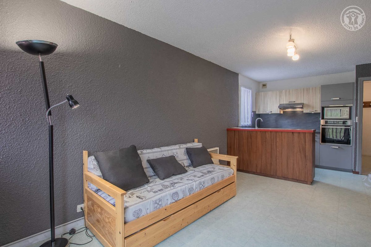 Appartement dans une résidence comprenant 14 logements, situé au 1er étage : entrée avec placards, séjour-cuisine coin salon (canapé gigogne 2 lits 1 personne), 1 chambre (1 lit 2 personnes 140x190 cm ; 2 lits superposés 1 personne), salle de bains (baignoire avec une tringle pour douche), WC séparé. Balcon d'angle. Parking en commun et privatif à la résidence.