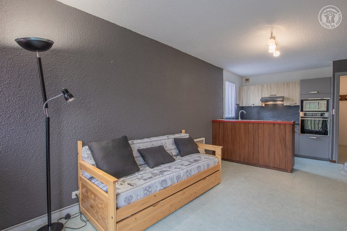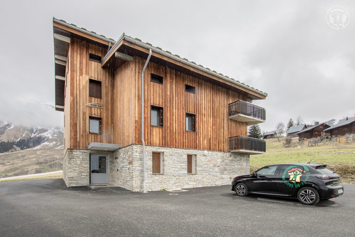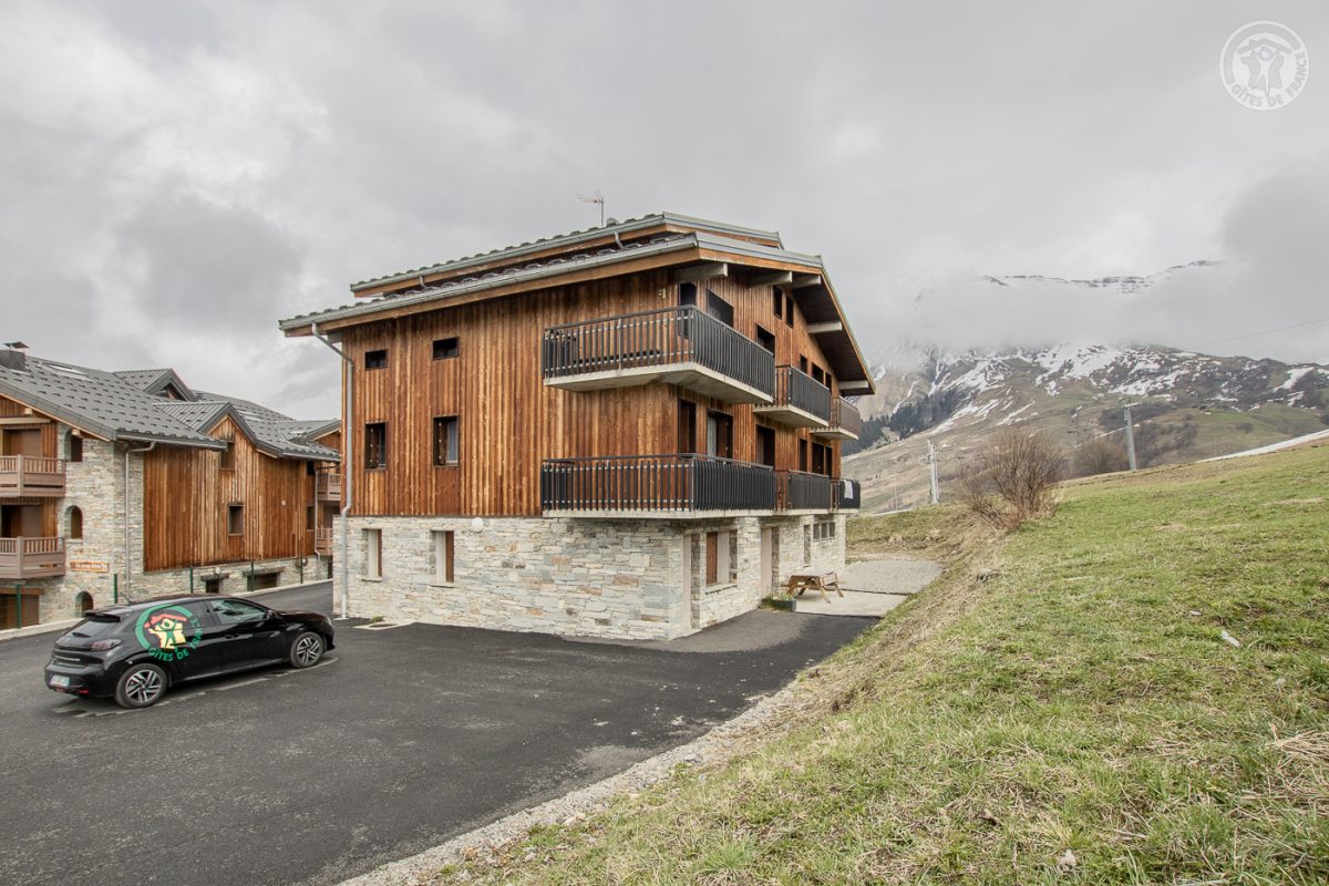 Appartement dans une résidence comprenant 14 logements, situé au 1er étage : entrée avec placards, séjour-cuisine coin salon (canapé gigogne 2 lits 1 personne), 1 chambre (1 lit 2 personnes 140x190 cm ; 2 lits superposés 1 personne), salle de bains (baignoire avec une tringle pour douche), WC séparé. Balcon d'angle. Parking en commun et privatif à la résidence. Petit immeuble de 2 étages (14 logements) situé en bordure de la piste avec accès à skis au télésiège ou au téleski du Grand Loup. Appartement rénové et fonctionnel. Commerces (ouverts uniquement durant les saisons touristiques) et arrêt de la navette skibus sur la place du village à 200 m. Belle vue sur la montagne et le village.