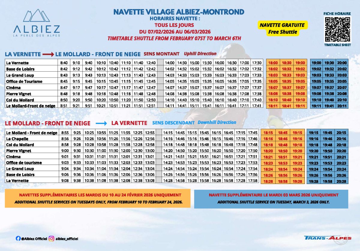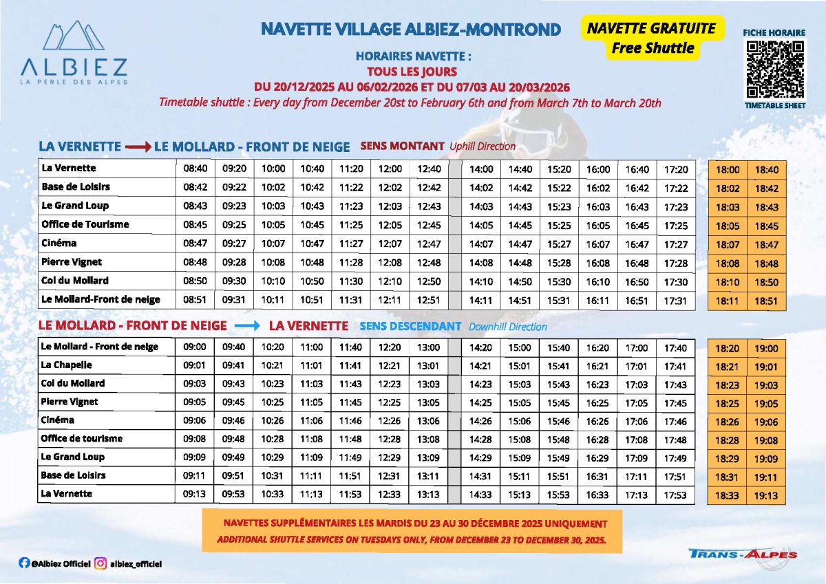 Du 20 décembre 2025 au 21 mars 2026, une navette est mise en place entre la gare Saint-Jean-de-Maurienne à Albiez