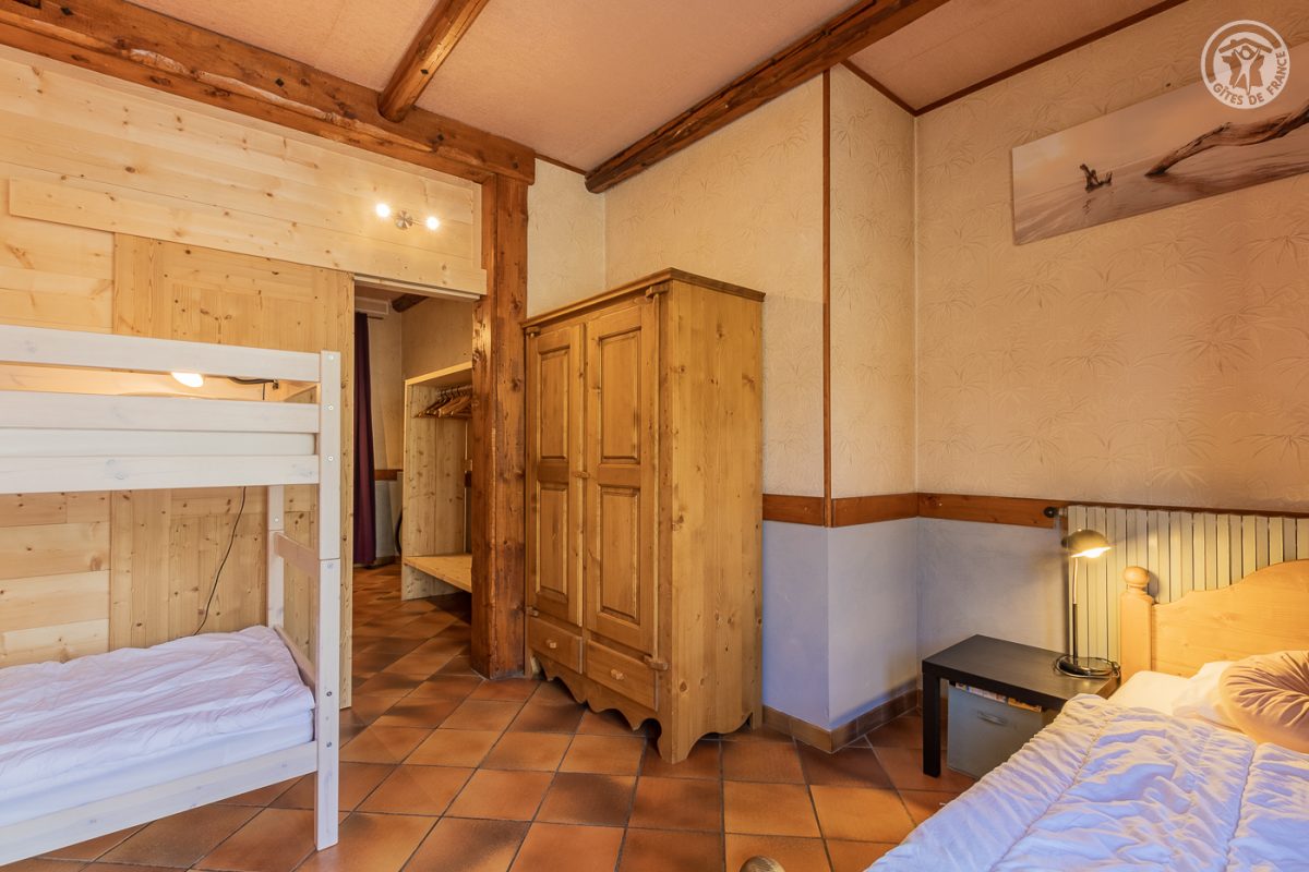 Gîte dans une maison comportant un autre gîte et une habitation. Sur 2 niveaux. Au rez-de-chaussée (entrée par un sas commun). Parking 2 places. Séjour-cuisine-salon. lecteur CD Bluetooth MP3, 3 chambres (1 lit 2 personnes 160x200 cm et 2 lits 1 personne superposés / 2 lits 1 personne en 90x190 cm et 2 lits 1 personne superposés / 1 lit 2 personnes 140 x 190 cm), une salle d'eau (douche avec WC). Au sous-sol : vaste salle de bain ouverte à laquelle on accède par l'escalier (pas de porte) avec WC séparé, douche fermée par un rideau et espace bain (baignoire) fermé par un rideau, buanderie séparée (lave-linge). Terrasse de 60 m2.