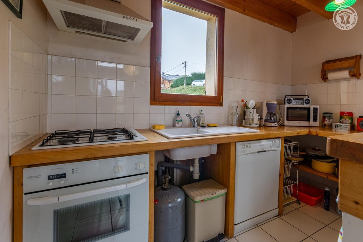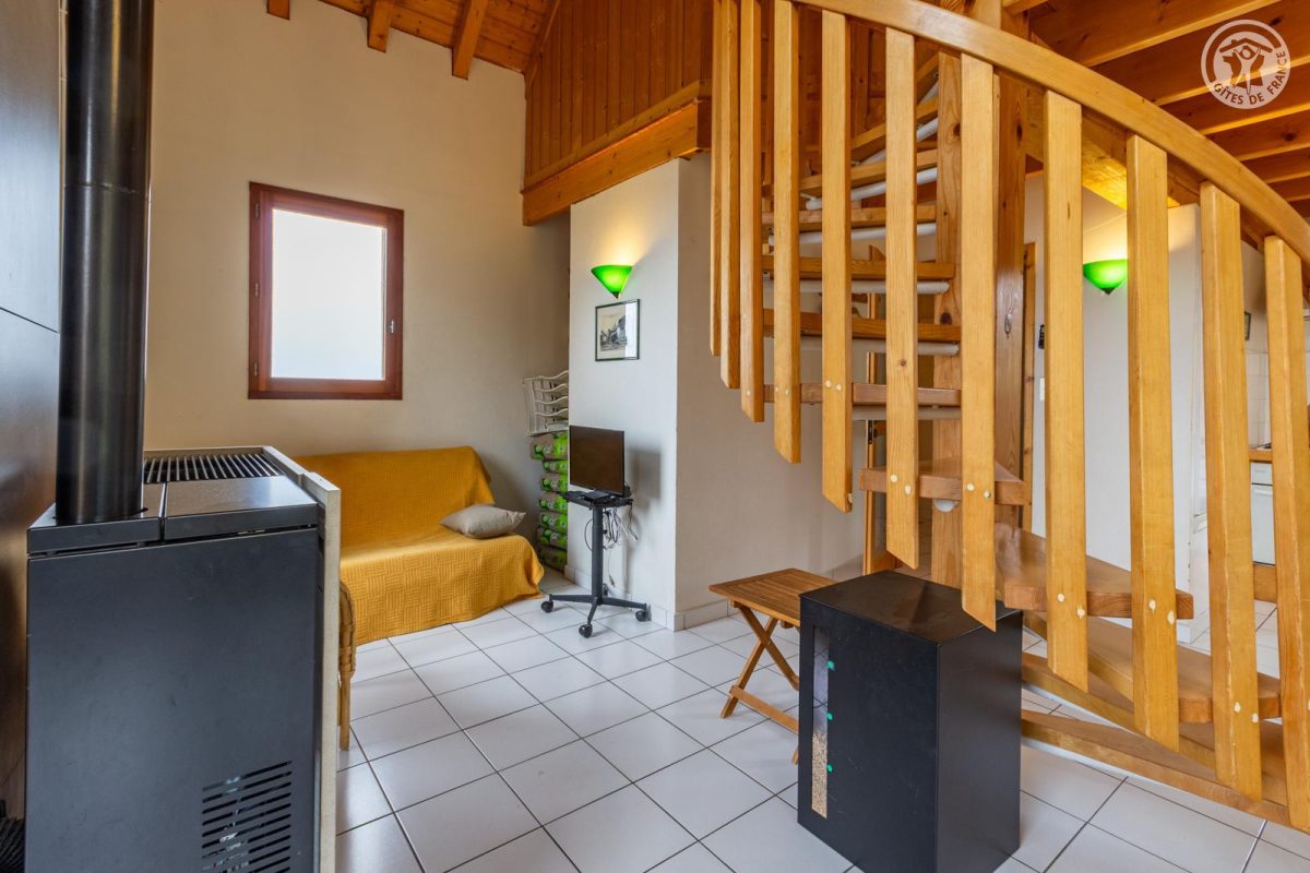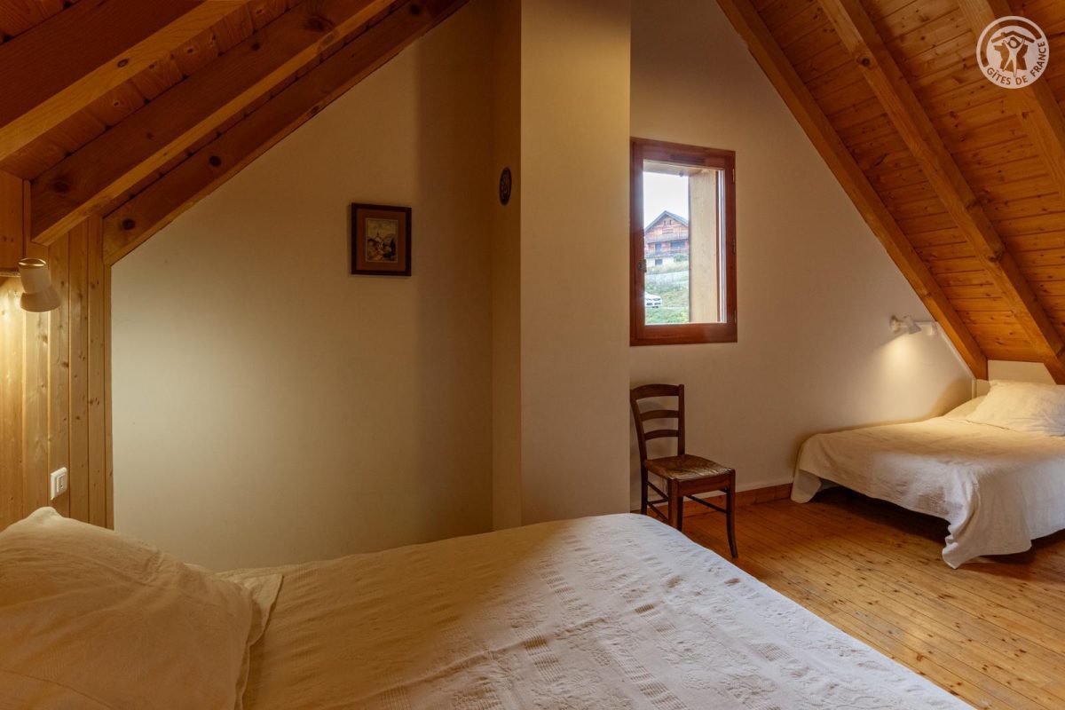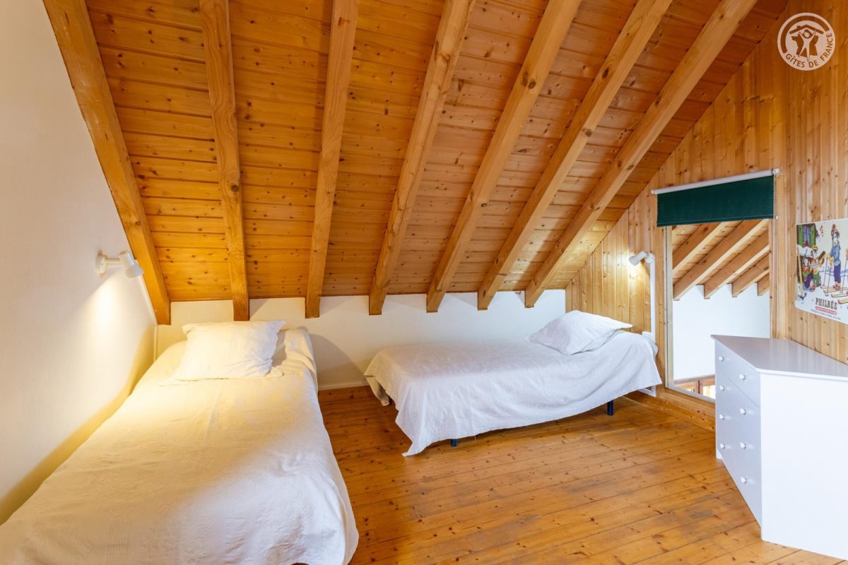 Chalet individuel. Rdc + 1er + 2ème étage : séjour-cuisine coin-salon, 3 chambres (2 lits 1 pers, 1 lit 2 pers/ 1 lit 2 pers/ 2 lits 1 pers), 2 SDB (douches). Balcon-terrasse + terrasse + terrain. Surface totale au sol : 95m² (mansardes incluses).