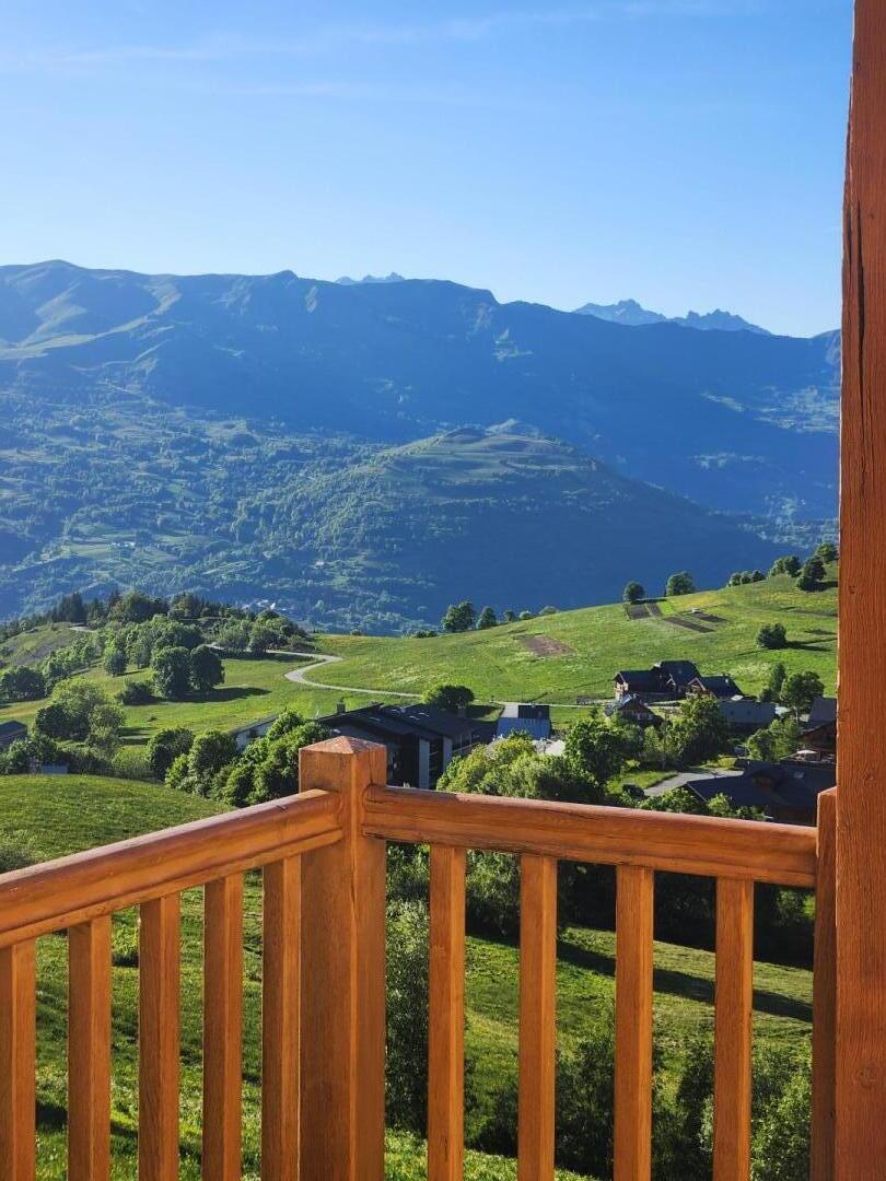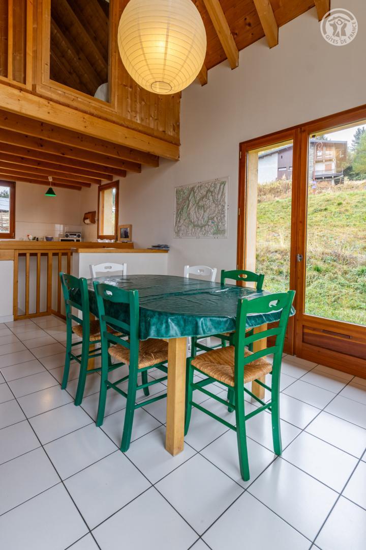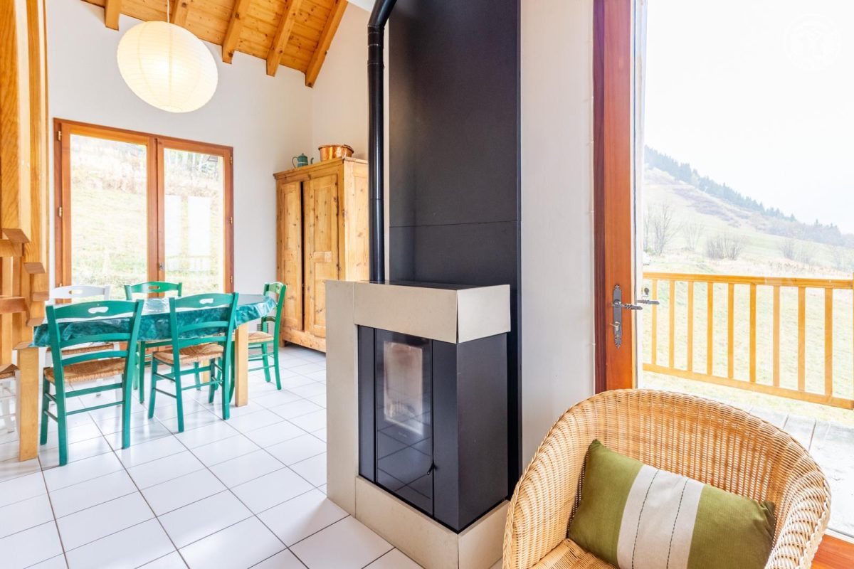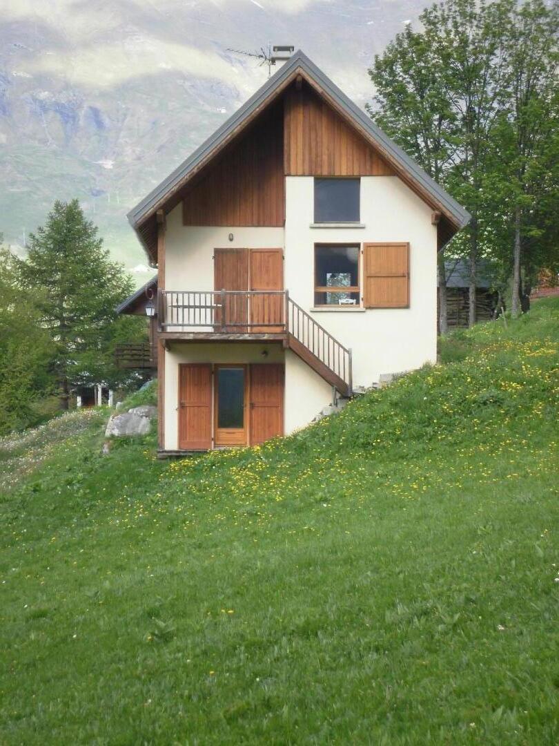 Chalet de pays sis à 500m des pistes (départ et retour skis aux pieds) et 500m du plan d'eau aménagé et surveillé. Hameau résidentiel calme. Coteau exposé. Charmant cadre naturel préservé de prairies. Bon confort. Terrasse expo + balcon-terrasse abrité. Vaste terrain naturel. Somptueux panorama.