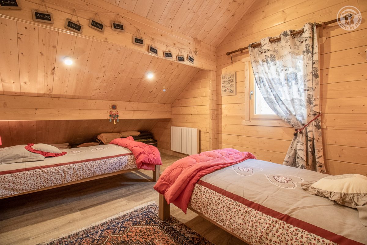 Chalet individuel. Rez-de-chaussée : salon-séjour-cuisine ouvert sur un balcon-terrasse, 1 chambre avec salle d'eau (douche à l'italienne) (1 lit 2 personnes 160x190 cm), WC indépendant. 1er étage : 3 chambres (1 lit 2 personnes 160x190 cm / 1 lit 2 personnes 160x190 cm / 2 lits 1 personne 90x190 cm), salle d'eau (douche à l'italienne), WC indépendant. Garage pour vélos et skis. Parking privatif. Terrain privatif avec terrain de pétanque.