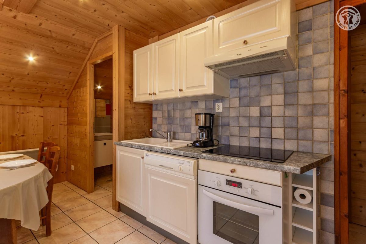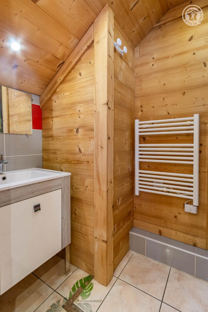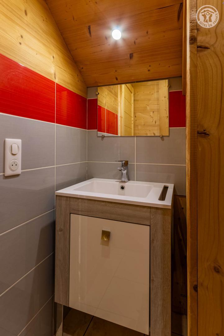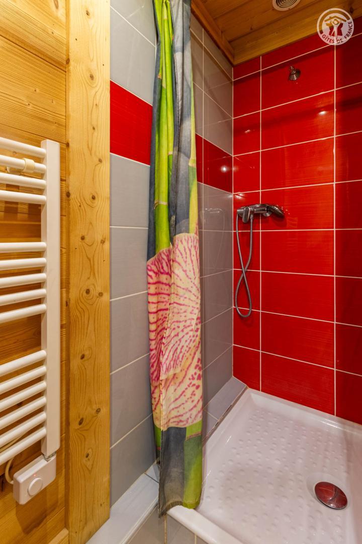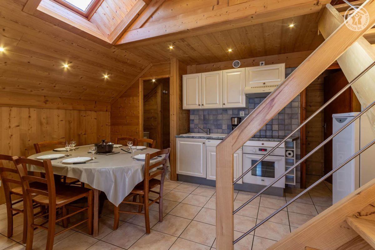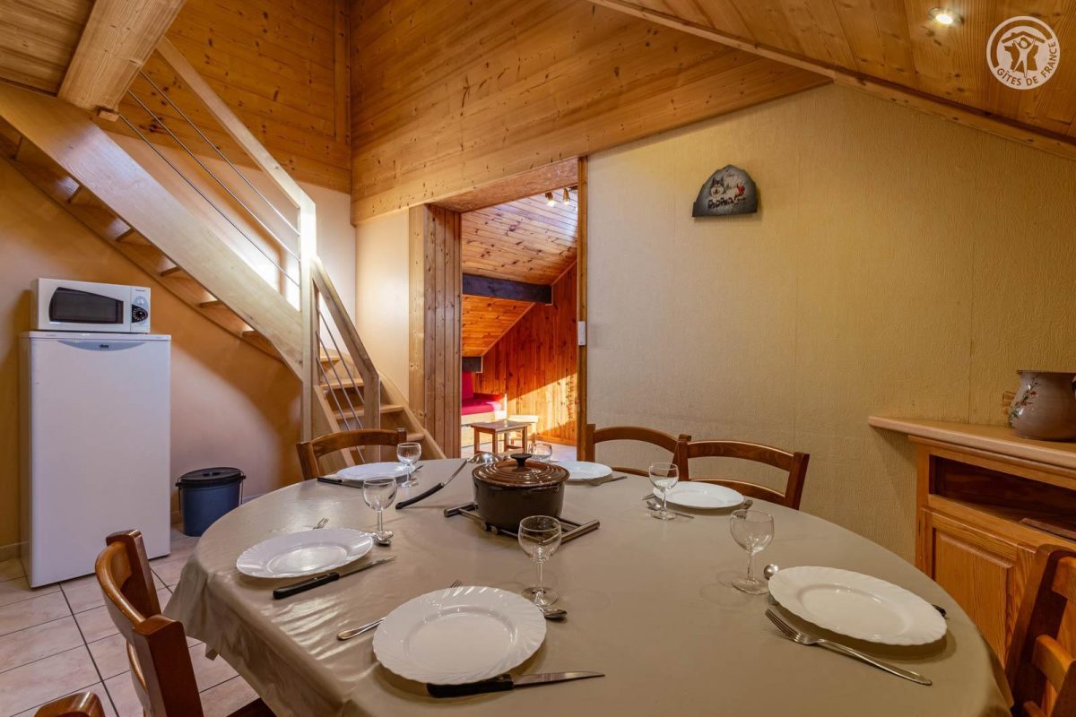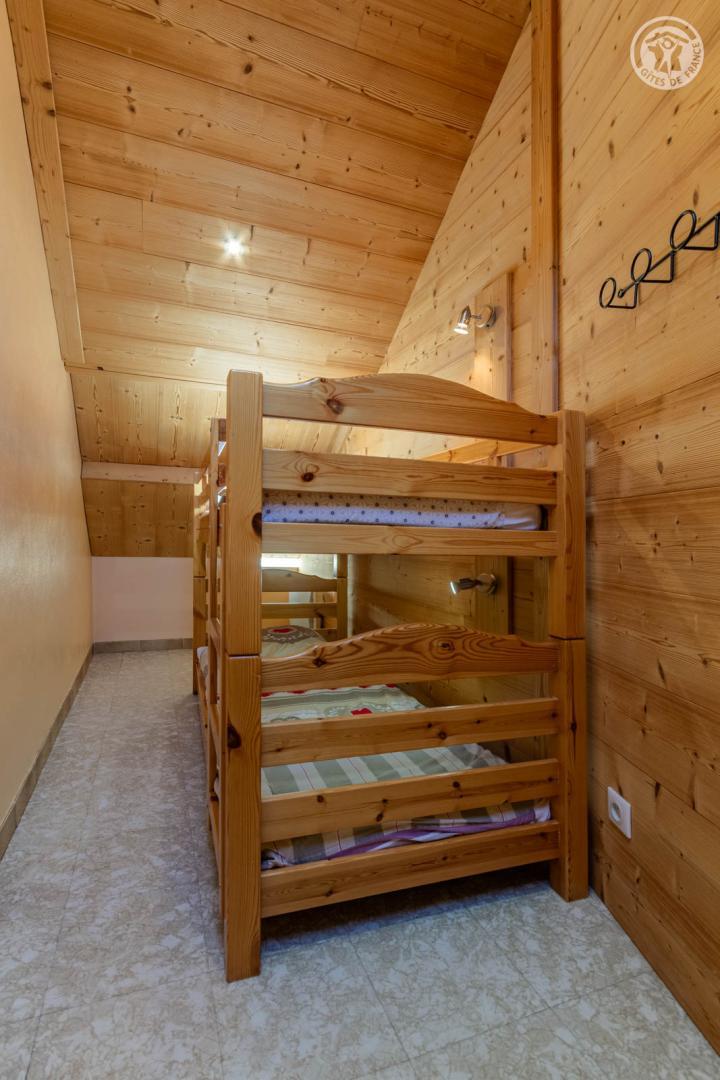 4 gîtes et un magasin de sports dans le même batiment. 2ème étage : séjour-cuisine coin salon (2 lits 1 personne gigognes 90 x 90 cm), 1 chambre (1 lit 2 personnes 140 x 190 cm), 1 chambre en sous-pente (2 lits 1 personne superposés 90 x 190 cm), salle d'eau (douche), WC séparé. Balcon. Lave-linge et sèche-linge dans buanderie commune à 200m (accès payant : 1 jeton gratuit ; au-delà, jetons payants). Terrain commun à 200m avec barbecue et espace repas extérieur. Surface totale au sol : 45m² parties mansardées comprises. Belle maison de pays au pied des pistes au coeur de la station village. Bon confort. Agréable et chaleureux. Balcon orienté sud. Belle vue dégagée sur le village et le massif. Terrain commun à 200m (balançoire, trampoline). Commerces, services et loisirs sur place.