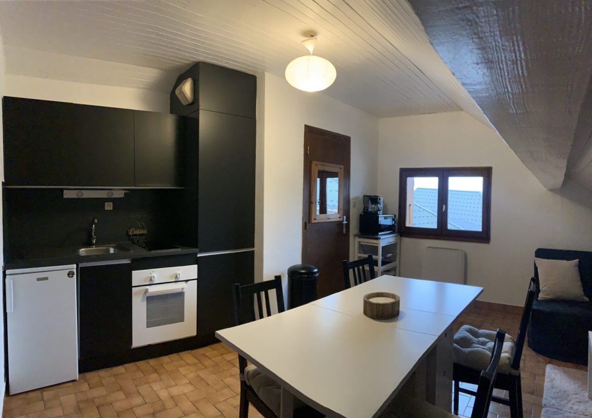Il se compose d'une pièce de 25m² avec 1 lit clic-clac, 1 lit gigogne (2 personnes) et 1 lit pliable (1 personne), une cuisine équipée (four, frigo, plaque à induction), des équipements électroménager (micro-ondes, appareil à raclette, télévision...), une salle de bain et un casier à ski.