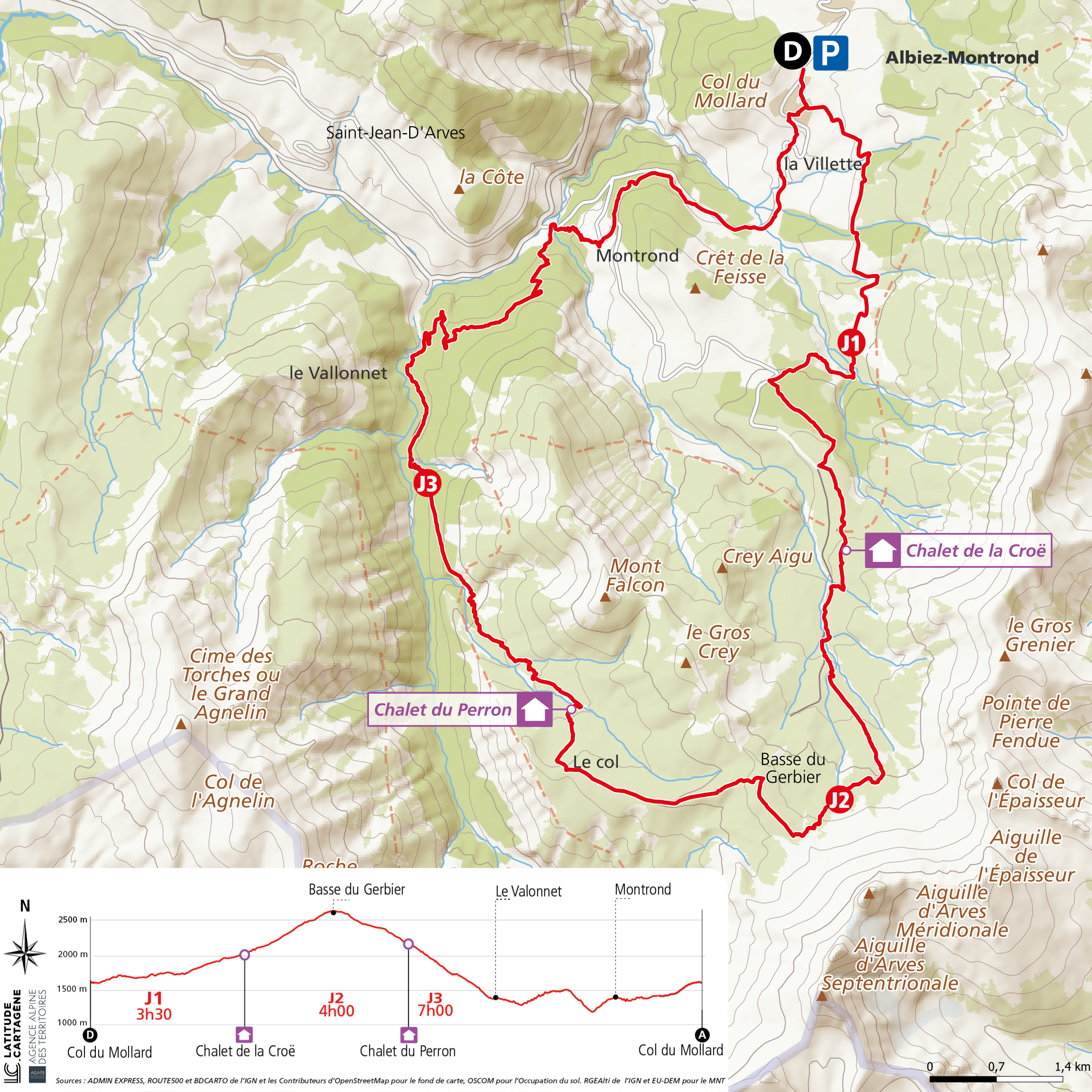 3/ JOUR 3 : Chalet du Perron -> Col du Mollard : 14.9 km / D+ 670 m / D- 1182 m Du chalet du Perron, prendre la piste direction Entraigues qui traverse des alpages puis redescend dans la forêt. Continuer jusqu’à Sous Pré Coton, puis tourner à droite pour remonter vers Pré Coton et la Forêt de la Fréchette. Redescendre ensuite sur Belleville, où il faudra tourner à droite sur la route des Arves. Suivre la route sur 150 m puis tourner à droite pour remonter sur Montrond. À Montrond La Ville prendre à gauche puis emprunter la route qui monte jusqu’à Sous La Feisse. Emprunter la piste située dans l’épingle pour rejoindre la Saussaz. Longer la route jusqu’à la Villette sud, prendre à gauche pour traverser le hameau puis prendre le sentier qui remonte jusqu’au col du Mollard.