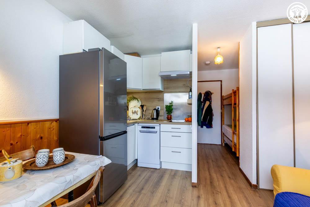 Studio au 1er étage d'une petite résidence de 4 étages "Le Bochate": séjour-coin cuisine avec 1 canapé-lit 140x190 cm, 1 coin montagne avec 2 lits 1 personne superposé 90x190 cm, salle de bain (baignoire) avec WC. Balcon. Stationnement public devant la résidence. Studio bénéficiant d'une situation privilégiée à 500m des pistes de ski de la station familiale des Bottières, petite station calme et agréable. Décoration simple et chaleureuse. Environnement immédiat de qualité, proche des sentiers de randonnée et de VTT en été. Nombreuses activités et services à la Toussuire à 8 km : parapente, pistes de VTT, cinéma, commerces...