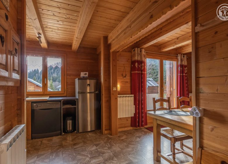 Chalet individuel sur 2 niveaux. Accès à pied 50m par un chemin en herbe depuis le parking commun, puis l'entrée du chalet par un escalier extérieur. Rez-de-chaussée : entrée, un séjour-cuisine avec coin salon donnant sur la terrasse, WC séparé. 1er étage : 3 petites chambres en sous-pente (1 lit 2 personnes 140x190 cm / 1 lit 2 personnes 140x190 cm / 1 lit 1 personne 90x190 cm), salle d'eau (douche avec hauteur à 1,70 m, WC).